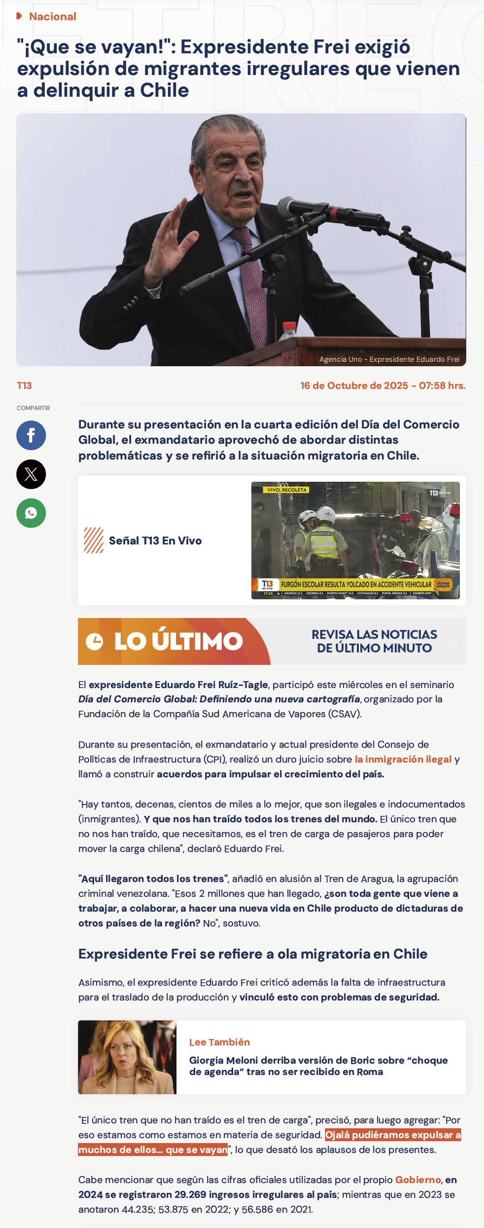“¡Que se vayan!”: Expresidente Frei exigió expulsión de migrantes irregulares que vienen a delinquir a Chile | T13.cl